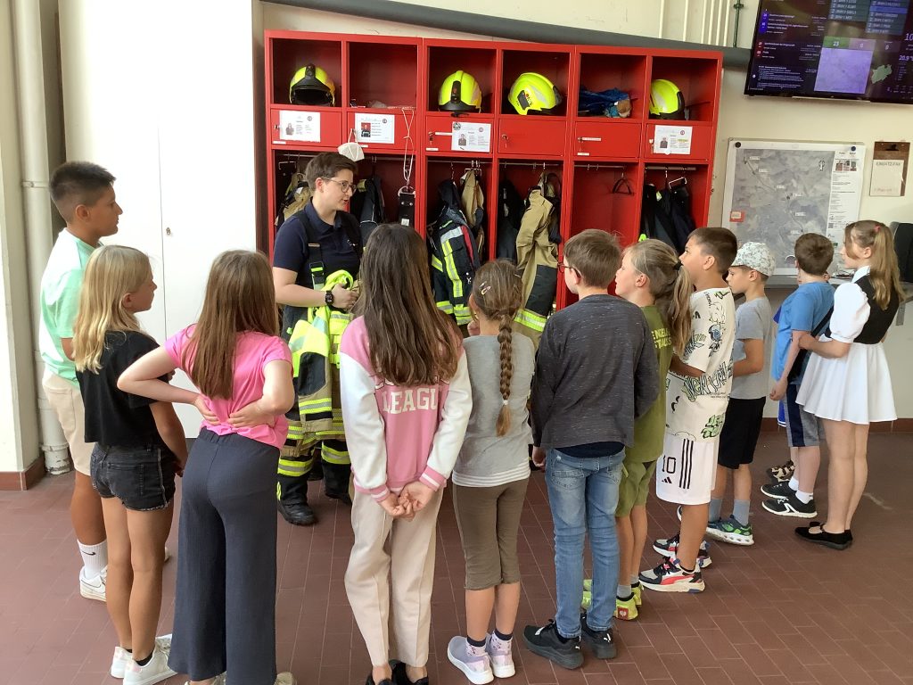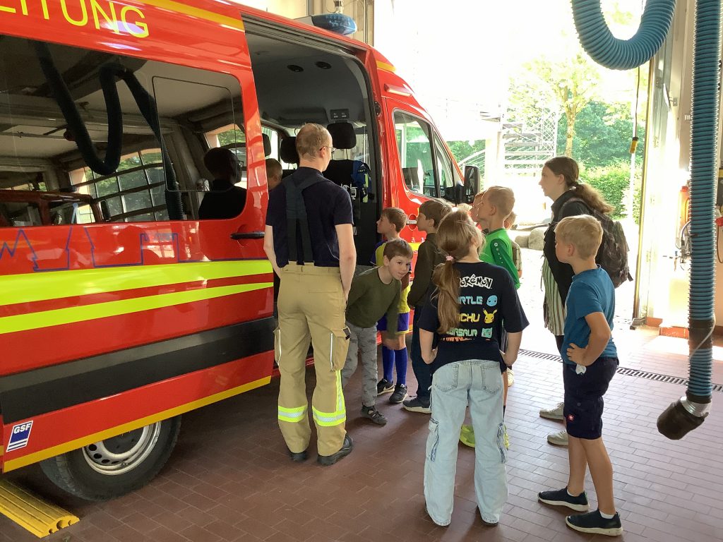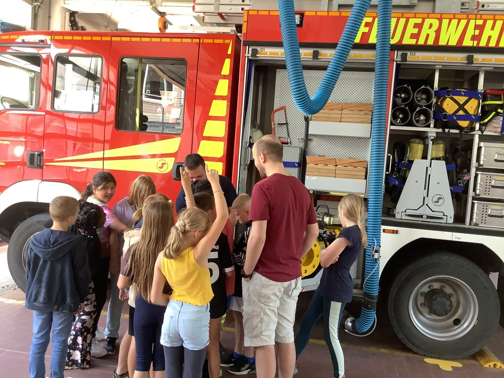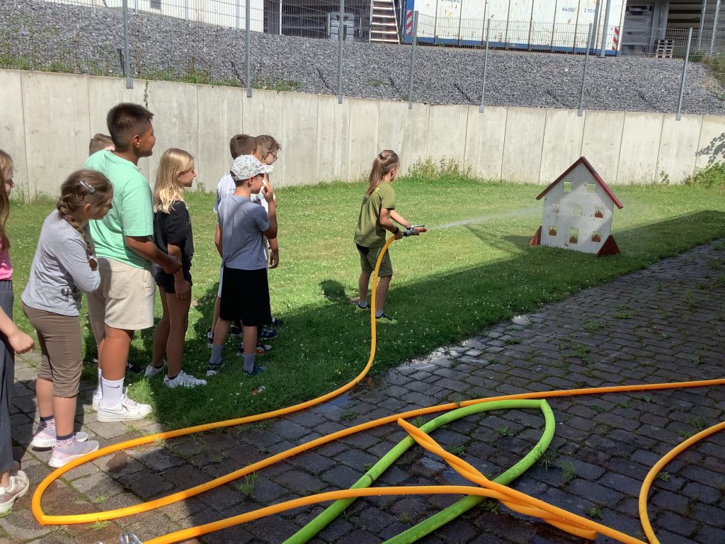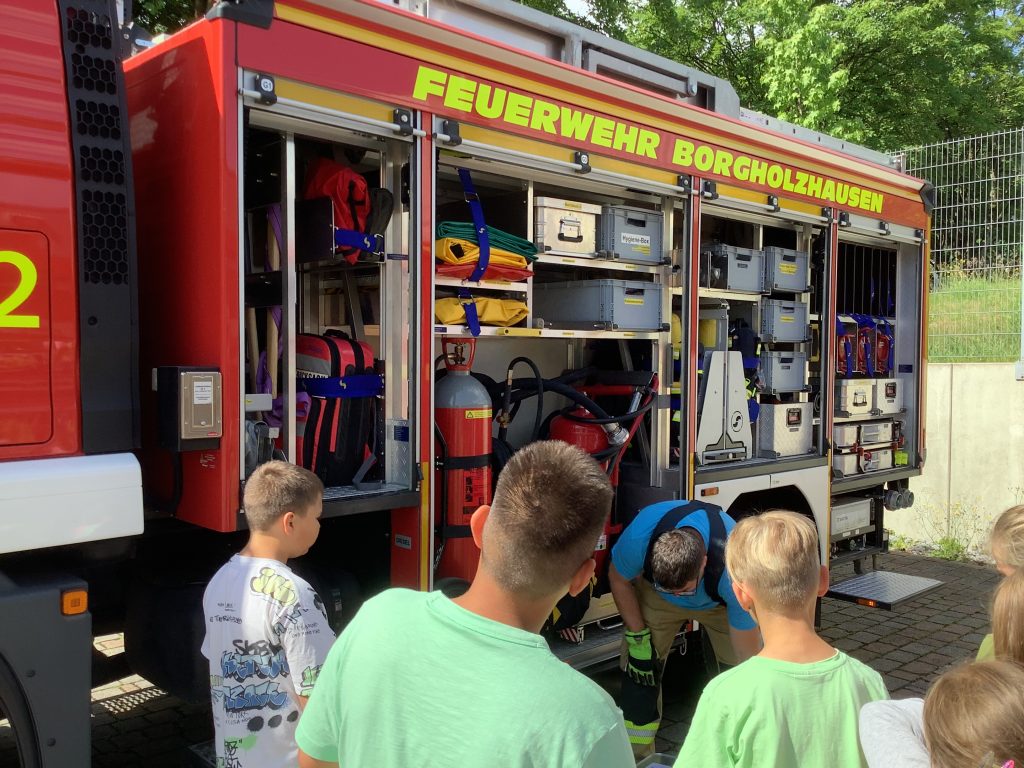 Bei strahlendem Sonnenschein trafen heute 60 gutgelaunte Drittklässler der Violenbachschule bei der Feuerwehr in Borgholzhausen ein. Nach einer kurzen Theorieeinheit wurden dann in kleinen Gruppen die unterschiedlichen Fahrzeuge vorgestellt, die Ausrüstung der Feuerwehrleute anprobiert und mit dem Wasserschlauch ein „brennendes“ Haus gelöscht. Zum Schluss gab es für alle Kinder noch eine wohltuende Abkühlung mit Badesachen unter einer riesigen Wasserfontäne. Alle waren von diesem tollen Ausflug begeistert und unser herzlicher Dank geht an die netten Leute von der Feuerwehr in Borgholzhausen!!!